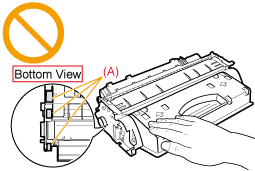 Hold the toner cartridges properly.When handling the toner cartridge, hold it properly, as shown in the illustration below. Do not stand it vertically or hold it upside down.