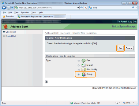 Select the check box of the destination which you want to add to the group and click [OK].