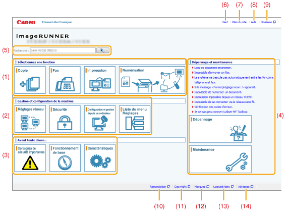 Vous trouverez ici un lien vers le contenu sélectionné, qui fournit des instructions de sécurité, les fonctions de la machine, et la façon de configurer et d'utiliser efficacement cette machine (par exemple, chargement du papier et utilisation du mode Veille.) |