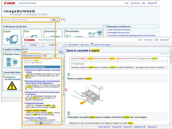 Saisissez un mot clé dans le champ prévu à cet effet, dans l'angle supérieur droit de la "page du haut" ou de la "page de rubrique", puis cliquez sur [ Vous pouvez également saisir votre demande dans la zone de recherche. Pour rechercher plusieurs mots clés, séparez-les par un espace (par exemple : "message encre" pour rechercher les rubriques contenant les mots clés "encre" et "message"). |