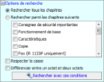 ![]() Définissez les critères de recherche, comme l'ensemble des chapitres dans lesquels effectuer la recherche, le respect de la casse ou la différenciation entre un et deux octets.