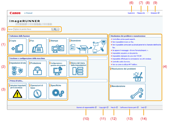 I link portano ai contenuti selezionati, in cui vengono descritte le istruzioni per la sicurezza, le funzionalità della macchina e le procedure per configurare e utilizzare la macchina in modo efficiente (ad esempio, caricamento della carta e utilizzo della modalità di riposo). |