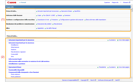 Mostra le categorie dell'e-Manual. Fare clic su una categoria per visualizzare l'elenco dettagliato della categoria.