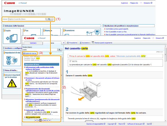 Inserire una parola chiave nel campo parola chiave/testo in alto a destra di "Pagina principale" oppure "Pagina dell'argomento", quindi fare clic su [ È possibile inserire la richiesta anche nella finestra di ricerca. Per cercare più parole chiave, separarle con uno spazio (ad esempio "Messaggio toner" restituirà gli argomenti che contengono le parole chiave "toner" e "messaggio"). |