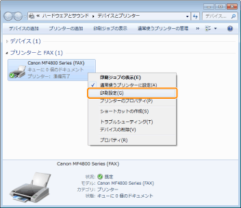 ](スタート)→[コントロールパネル]→[プリンタ]をクリックしてください。Windows XP/Server 2003の場合は、[スタート]→[プリンタとFAX](または[スタート]→[コントロールパネル]→[プリンタとその他のハードウェア]→[プリンタとFAX])をクリックしてください。
