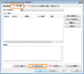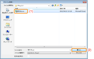 読み込み可能なファイルは、CSV形式のファイル、あるいはCanon Address Bookファイル(*.abk)です。