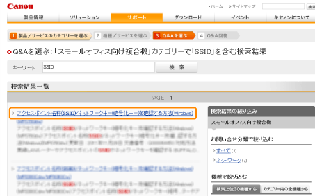 [検索結果一覧]の”アクセスポイント名称(SSID)/ネットワークキー(暗号化キー)を確認する方法(Windows)”をクリックします。