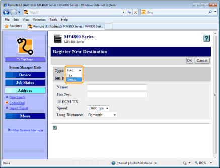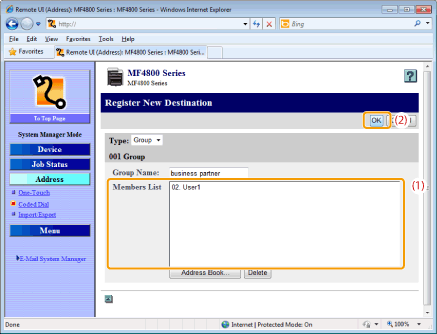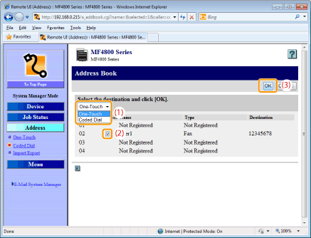 Click [One-Touch] or [Coded Dial] from the drop-down list, select the check box for the number to be added in a group, and then click [OK].