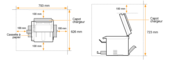 (Si vous envisagez d'utiliser la machine pendant une durée prolongée ou que vous souhaitez effectuer une grande quantité d'impressions dans une pièce mal ventilée, l'environnement de travail risque de devenir trop confiné, en raison de l'ozone et autres émissions dégagées par la machine. De plus, des particules chimiques sont émises pendant l'impression ; par conséquent, prévoyez une ventilation adéquate de la pièce afin de maintenir un environnement de travail sain.) |