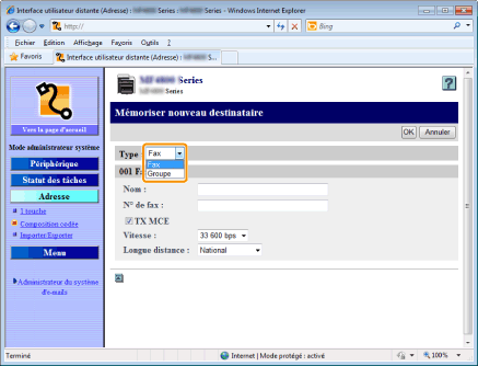 ] ou [ ] pour sélectionner <Fax>, puis appuyez sur [OK].![]() |