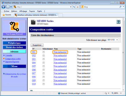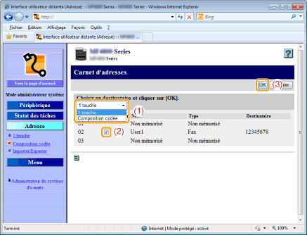 Cliquez sur [1 touche] ou sur [Composition codée] dans la liste déroulante, cochez la case du numéro à ajouter à un groupe, puis cliquez sur [OK].