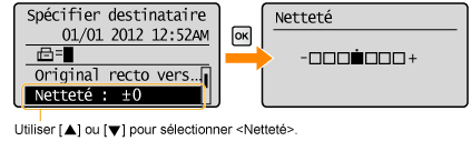 Pour obtenir des textes et des lignes d'une grande netteté lors d'une numérisation, réglez le curseur à un niveau adapté sur l'échelle <+>. Ce réglage convient particulièrement à la reproduction de documents avec des éléments fins, comme les tirages de plan ou les dessins au crayon.