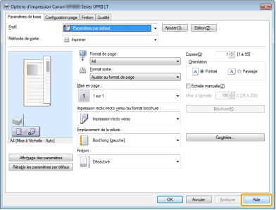 Vous pouvez afficher l'aide en ligne en cliquant sur [Aide] dans l'écran du pilote d'imprimante.