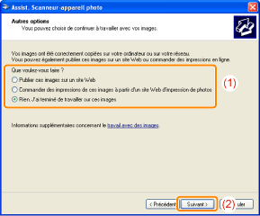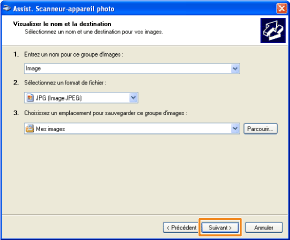 Pour plus de détails, consultez les étapes 6 à 14 de la section "Numérisation à partir de la boîte de dialogue [Assist. Scanneur-appareil photo] (Windows XP uniquement)".