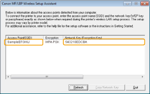 Si le SSID et la clé réseau ne sont pas indiqués sur le boîtier du routeur sans fil ou du point d'accès, ou s'ils ont été modifiés, vous pouvez les obtenir à l'aide de l'Assistant de configuration sans fil Canon MF/LBP.