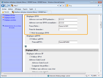 Avant de configurer les réglages DNS, voir "Attention (Réglages DNS)".
