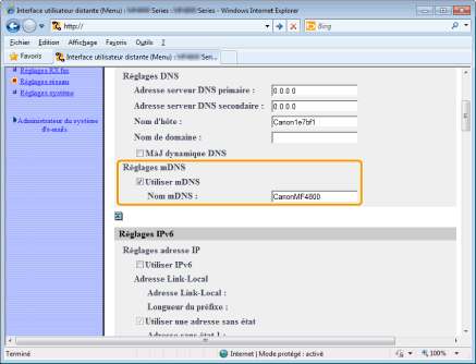 Vous pouvez utiliser l'adresse IP de la machine sans la figer, en activant la fonction de mise à jour dynamique du DNS, et en définissant les options [Nom d'hôte] et [Nom de domaine].