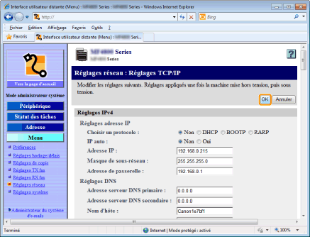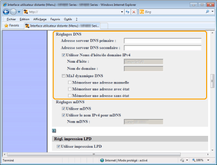 Vous pouvez utiliser l'adresse IP de la machine sans la figer, en activant la fonction de mise à jour dynamique du DNS, et en définissant [Nom d'hôte] et [Nom de domaine] via LPR.