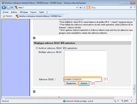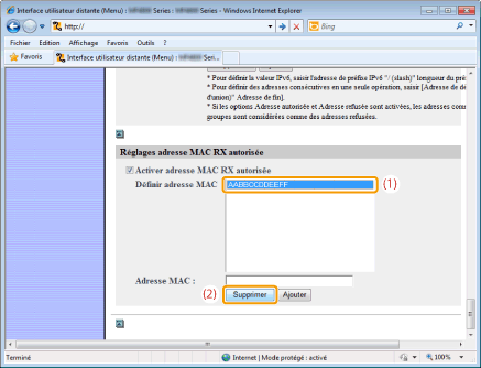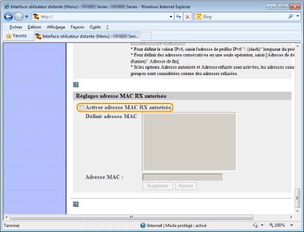 Lorsque la case [Activer adresse MAC RX autorisée] est sélectionnée :L'accès depuis les adresses MAC non autorisées est interdit. Vérifiez bien l'adresse MAC lorsque vous la saisissez.