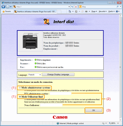 saisissez le [PIN administrateur système]. [Mode Utilisateur final] :