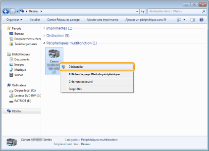 Cliquez avec le bouton droit sur l'icône de la machine, puis sélectionnez [Désinstaller] dans le menu contextuel.