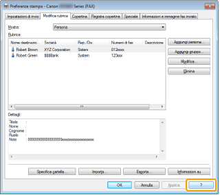 Per aprire la guida in linea, fare clic su [Guida] nella schermata del driver del fax.