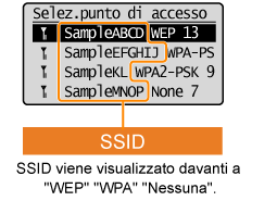Selezione di un Access Point:Per la selezione di un Access Point, il sistema di autenticazione WEP 802.11 è impostato su <Sistema aperto>, mentre il metodo di crittografia WPA/WPA2 è impostato su <Autom.> (AES-CCMP o TKIP).