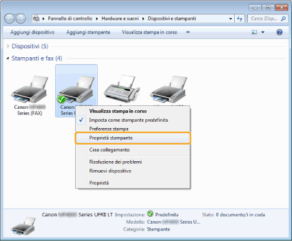 Fare clic con il pulsante destro del mouse sull'icona della macchina e scegliere [Proprietà stampante] (o [Proprietà]).