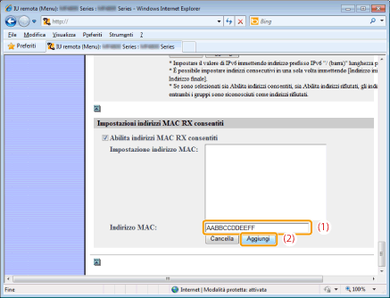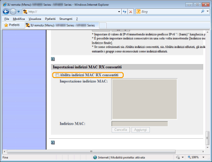 Quando è selezionata l'opzione [Abilita indirizzo MAC RX consentito]:L'accesso da indirizzi MAC non autorizzati viene negato. Controllare più volte l'indirizzo MAC inserito.