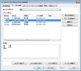 [アドレス帳の編集]タブの表示方法については、「ファクス送信する(PCファクス)」または「あらかじめファクス送信の設定をする(PCファクス)」を参照してください。