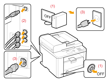 If these items are dropped or spilled inside the machine, immediately turn OFF the power switches of the machine and computer (1) and disconnect the interface cable if it is connected (2). Then, unplug the power plug from the AC power outlet (3) and contact your local authorized Canon dealer. ![]() |