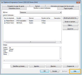 Vous pouvez afficher l'aide en ligne en cliquant sur [Aide] dans l'écran du pilote du fax.