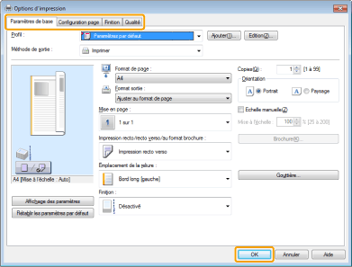 Si la machine que vous utilisez prend en charge l'impression recto-verso, le réglage par défaut adopte ce mode d'impression. Si vous voulez imprimer uniquement en mode recto, voir "Configuration des réglages d'impression par défaut".