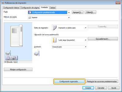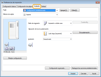Para obtener las instrucciones acerca de cómo acceder a la pantalla del controlador de impresora, consulte "Impresión" y "Configuración de las opciones de impresión predeterminadas".