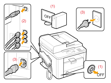 이러한 물체가 기기 내부로 들어가거나 엎질러진 경우, (1) 즉시 기기와 컴퓨터의 전원 스위치를 끄고 (2) 연결된 인터페이스 케이블을 분리하십시오. 그런 다음 (3) AC 전원 콘센트에서 전원 플러그를 뽑고 지역 공식 대리점에 문의하십시오. ![]() |