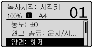 양면 복사 시 주의 사항:양면 복사 작업이 완료될 때까지 문서를 만지지 마십시오. 앞면 복사가 완료되면 원고는 부분적으로 출력되어 대기 상태에 있다가 다른 면을 복사하기 위해 다시 기기에 삽입됩니다.