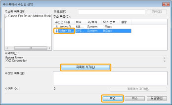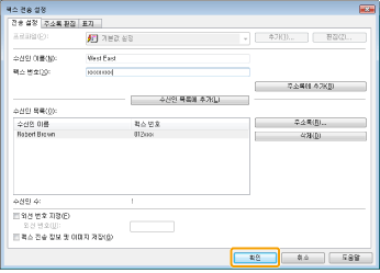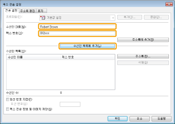 [기타] 탭의 [보안 설정] 대화 상자에서 [수신인을 [수신인 목록]에 추가하기 전에 팩스 번호 다시 입력하기]를 선택하면 [수신인 목록에 추가]를 클릭할 때 [수신인 확인] 대화 상자가 표시됩니다. 자세한 내용은 온라인 도움말을 참고하거나 '온라인 도움말 보기(PC 팩스)'를 참고하십시오.