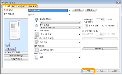 [기본 설정] 탭은 드라이버의 기본 설정 몇 가지로 구성됩니다. [기본 설정] 탭에서 구성할 수 있는 설정은 다른 탭에서도 구성할 수 있습니다.