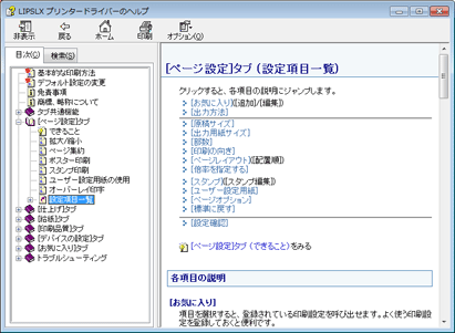 右側のウィンドウに、現在表示されているプリンタードライバー画面についての説明が表示されます。