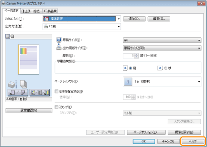 プリンタードライバー画面の[ヘルプ]をクリックすると、ヘルプが表示されます。