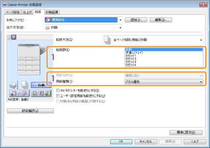 特定の用紙にプリントしたい場合、その用紙がセットされている給紙部、またはその用紙種類を指定します。