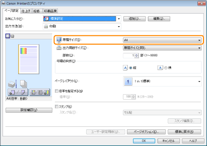 印刷設定画面の表示方法については、「プリンタードライバーを表示して印刷する」または「あらかじめ印刷の設定をする」を参照してください。