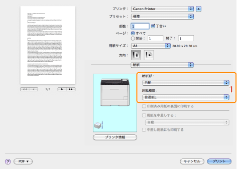 特定の用紙に印刷したい場合、その用紙がセットされている給紙部、またはその用紙種類を指定します。