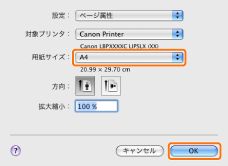 Mac OS X 10.5.xの場合、アプリケーションソフトウェアによっては、[ページ設定]ダイアログは表示されません。このようなアプリケーションソフトウェアでは、[プリント]ダイアログで用紙サイズ、用紙の向き、拡大縮小率の設定を行います。[プリント]ダイアログの表示方法については「プリンタードライバーを表示して印刷する」を参照してください。