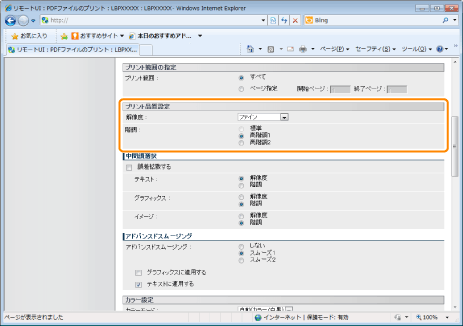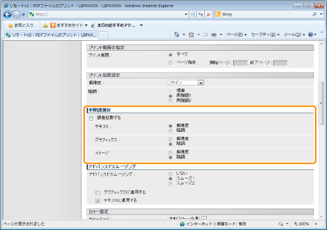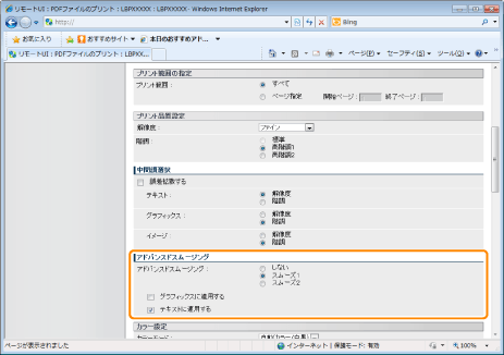 グラフィックス(アプリケーションソフトで作成されたイラスト)や文字の輪郭をなめらかに印刷するスムージング処理を使用するかどうかを設定します。
