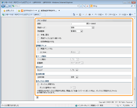プリンターのSDカード(ボックス)に保管する場合は、チェックマークを付けて、保管先のボックスを選択します。