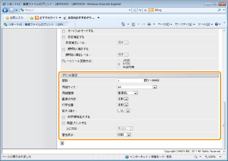 画像を印字する位置を[自動]、[中央]、[左上]から選択します。[自動]を選択すると、TIFF形式のデータで印字位置が指定されている場合は、指定された位置に印字します。印字位置が指定されていない場合は、中央に印字します。JPEG形式のデータには印字位置の指定がないため、[自動]を選択した場合は、中央に印字します。