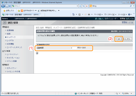 本プリンターの電源を入れてから通信を開始するまでの待機時間(0 ~ 300 秒)を入力します。