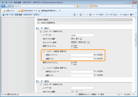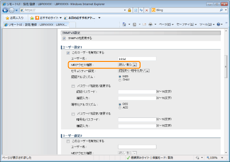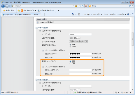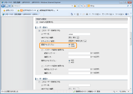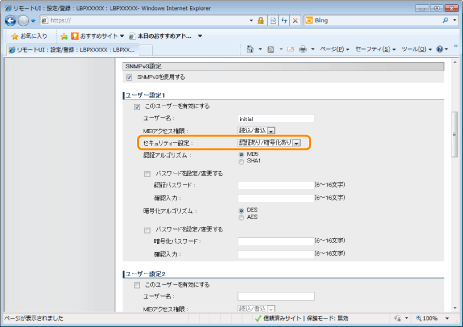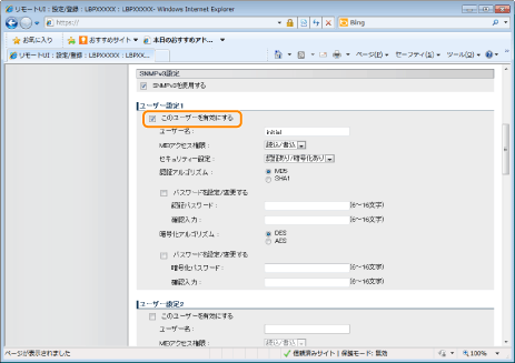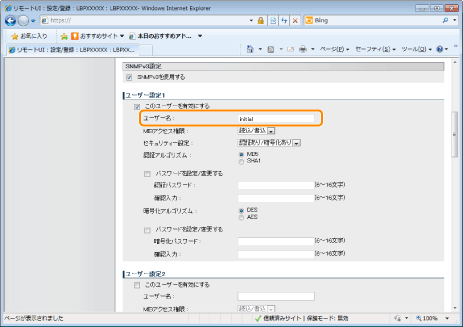 SNMPv3プロトコルで使用するユーザー情報を設定するときは[ユーザー設定1] ~ [ユーザー設定5]でユーザー情報の設定を行います。