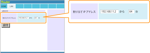 この例では、ルーターがDHCPで割り当てるIPアドレスの範囲は192.168.11.2 ~ 192.168.11.65 なので、本機には、192.168.11.66 ~ 192.168.11.254 の範囲のIPアドレスを割り当てます。